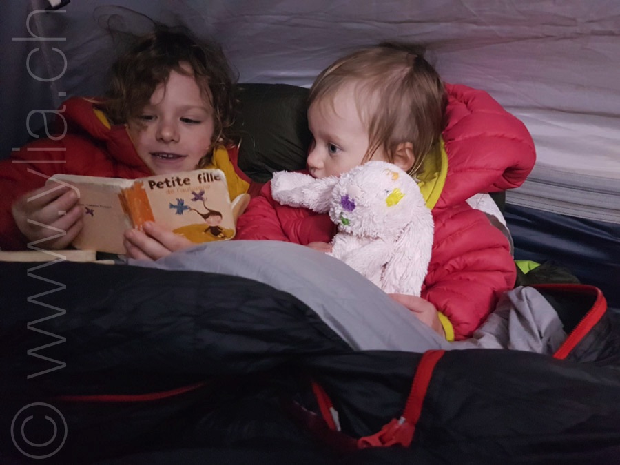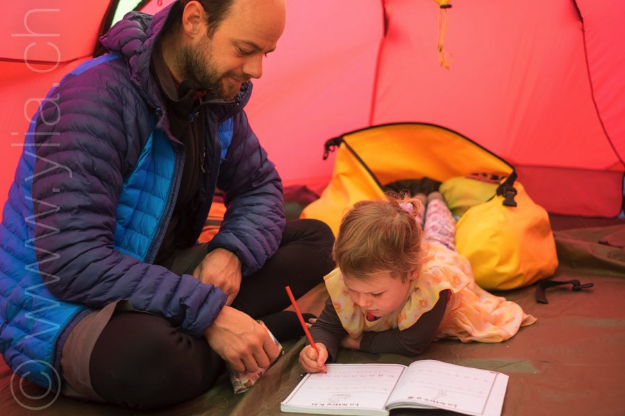 Nomads, we offer Nayla and her sister Fibie tools to create their lives. Nayla was swimming at 2 years old. She was cycling and skiing at the age of 3. Dancing is her passion. We teach them to respect their bodies doing yoga and invite them to meditate. Now Nayla is supposed to go to school, so we choose to trust natural learning. Sometimes we create ephemeral art in the middle of a field, we paint in front of the mountains, we learn to write inside the tent. But really, everything is an excuse to learn, even for us.