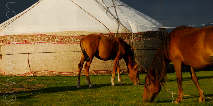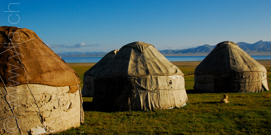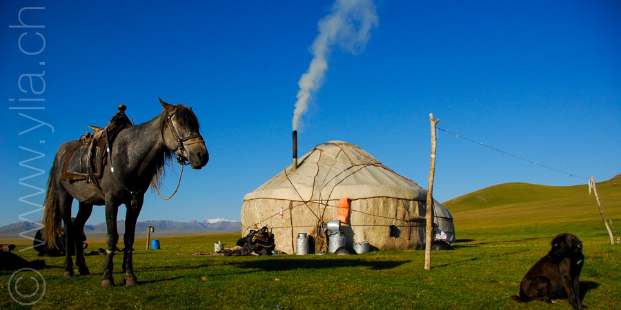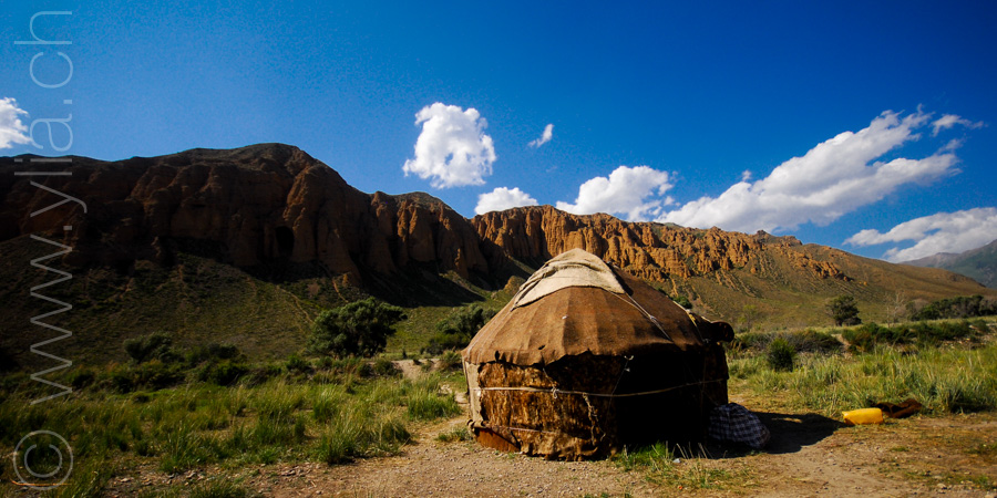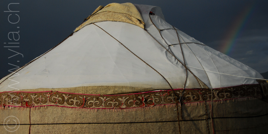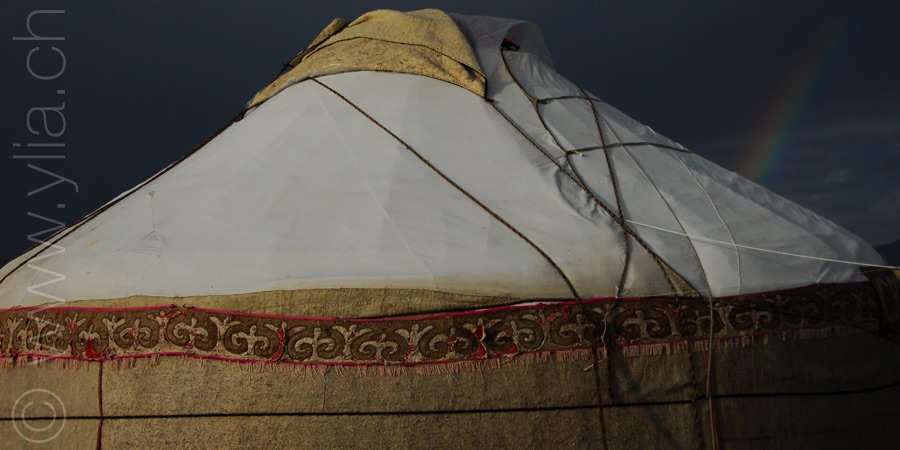 In this powerful scenery, the Kirghiz lifestyle took place. The yurts, boozi, appeared in these green meadows. The sun reflected the whiteness of their Ulducks and Tuldrucks, large pieces of felt, creating a warm and waterproof environment. They were placed over flexible wooden sticks, the kereges and the tchi. The Tyndynk, symbol of the Kirgiz flag, is a wheel that supported the roof, while leaving a central opening letting the light penetrating this universe of mutton smell. The colourful shyrdaks, felt carpet, created a warm-hearted atmosphere inside.