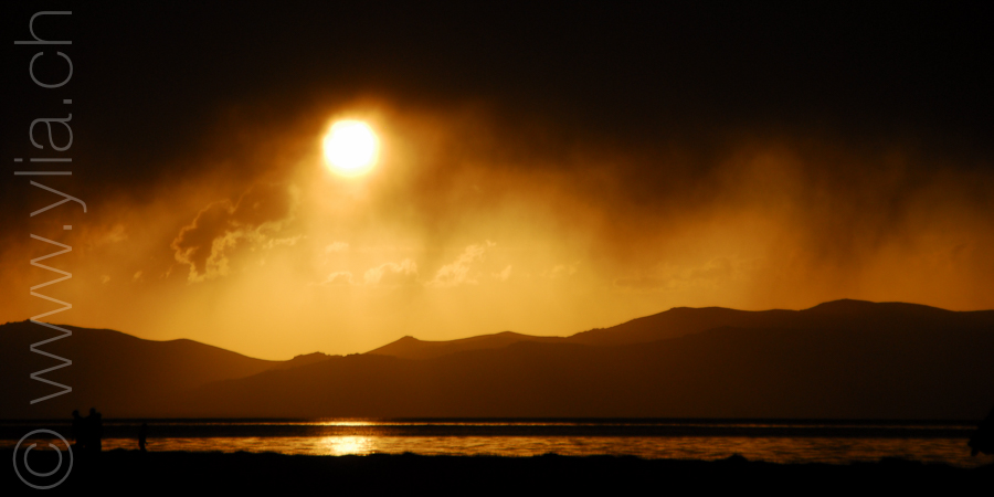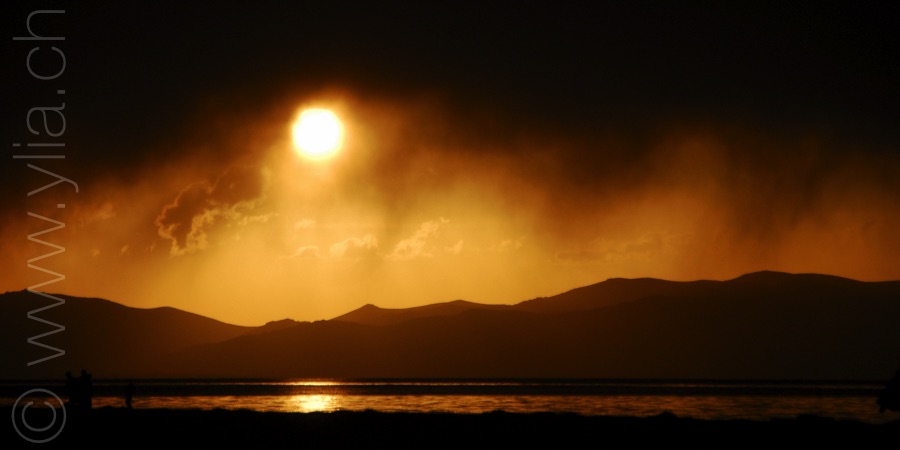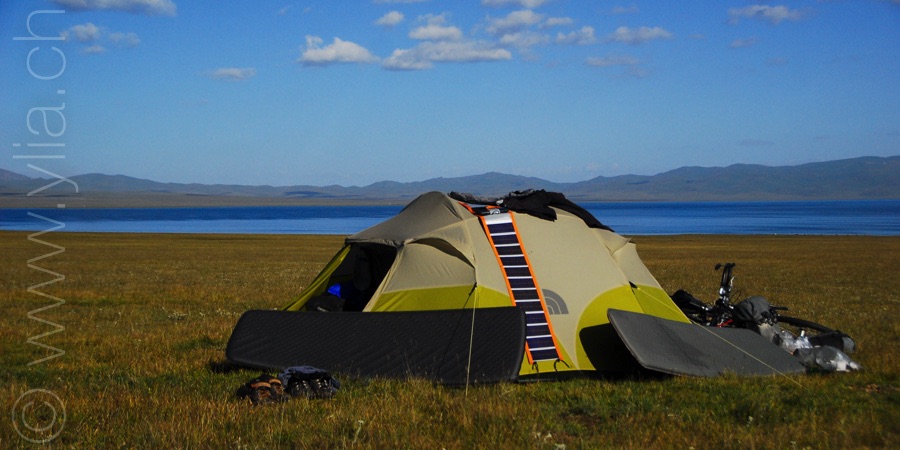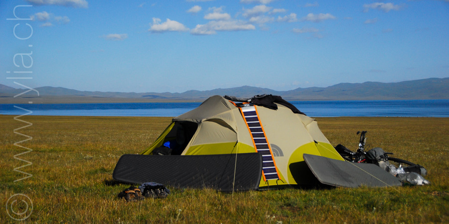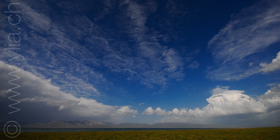 One after the other, we crossed passes to reach the astounding Song Kol lake, which spread in the middle of a vast steppe, smooth like a mirror, reflecting a couple of white cumulus that were gently growing. Over there, storms were violent and powerful thunders and lightenings were echoing on the land. Back clouds created moving waves of rain filtering the red lights of the sunset.