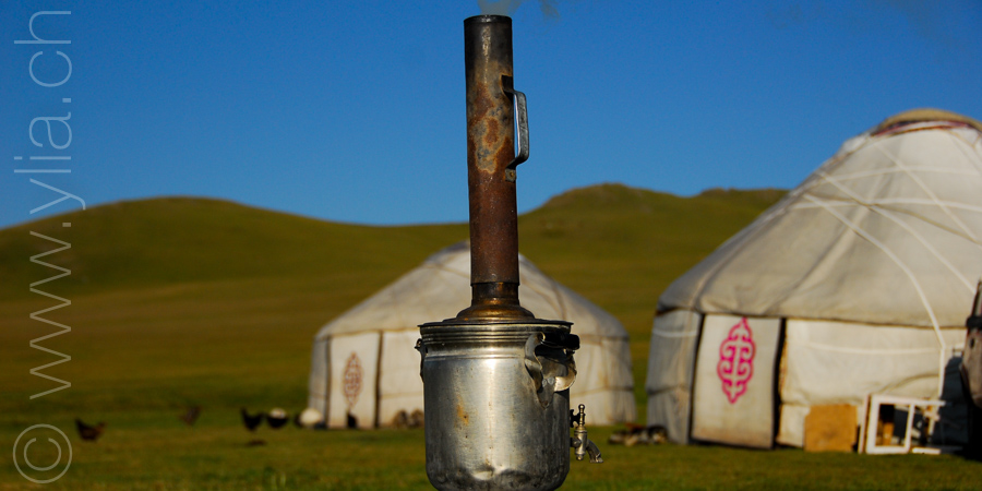 A small wooden fire, otshok, brought warmth to the home and the smell of boiled meat. That food as well as bread and boursuk, fried bread, are the main dishes. The cows, goats and sheep gave their milk for the cream and Kurut, small blows of dried yogurt. And the Koumiz, fermented milk, was made with the horses’ milk that are milked up to five times of day. Outside, the tea was prepared in a teapot that look like a trophy, and where a small fire was lightened in order to boil the water.