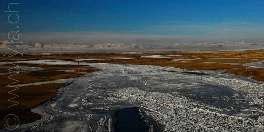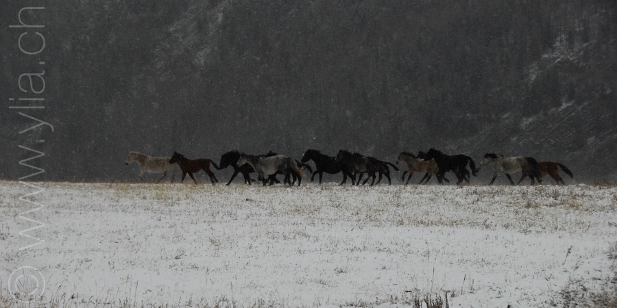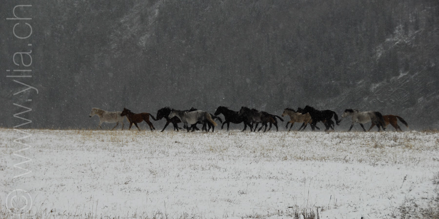 The mist that covers the whole plain, lay down a freezing humidity and creates a pastel blue filter that form a serene atmosphere. The silence enveloping your land seems to touch the high summits of the Altai Mountains, bringing back the echo of their whispers. The rivers are now icy formations, but the farouche water that freed itself in the rapids engenders a steam. And its waves are dissipating with lightness in an inspiring dance. Two horses with thick hair gallop freely in these gigantic spaces covered by snow, right in front of the alpine scenery.