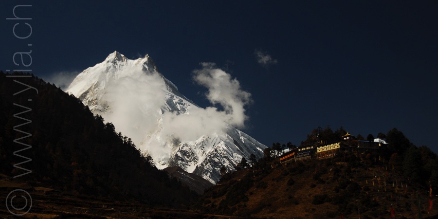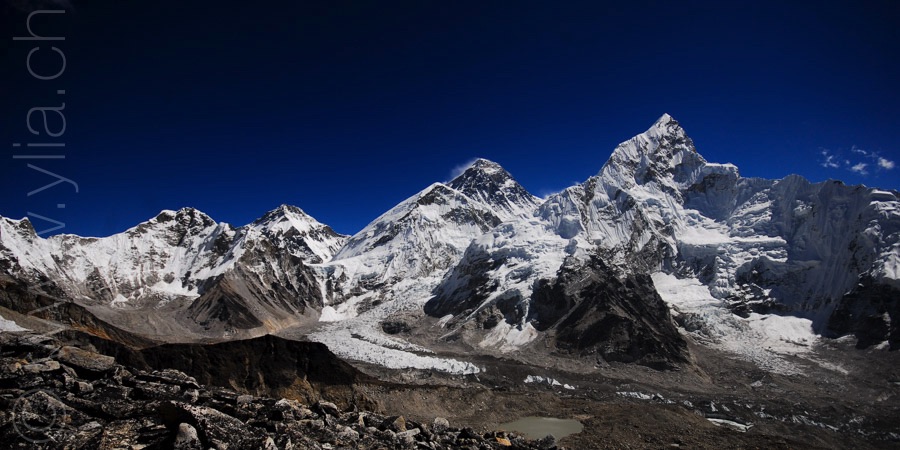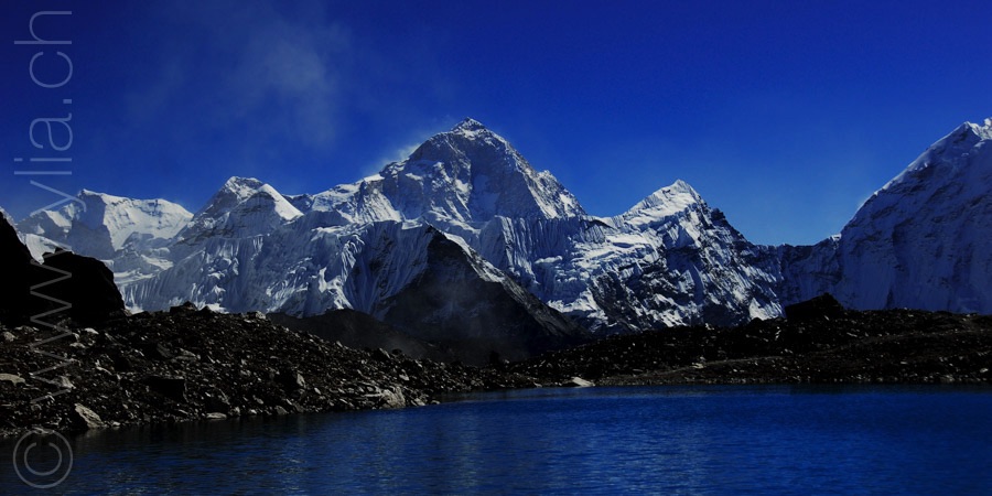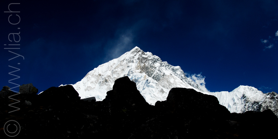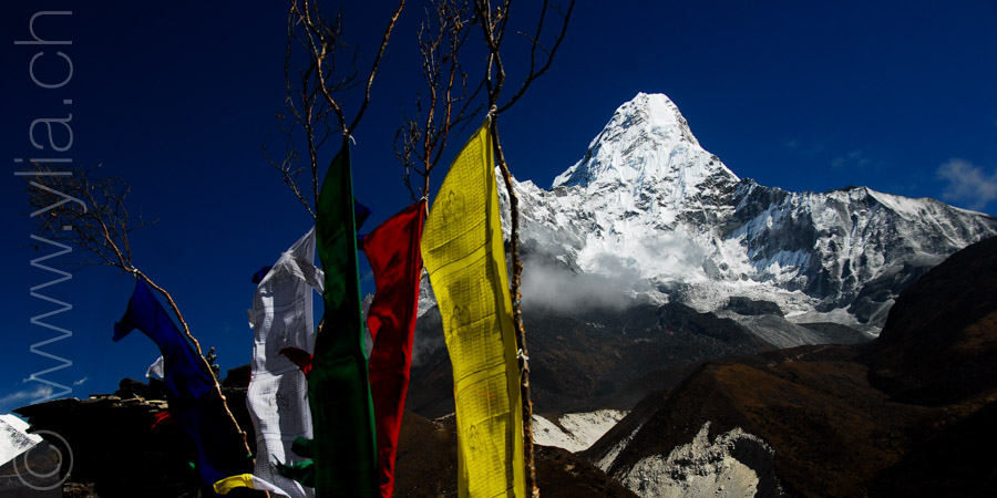 Later it is the encounter with the summits, with their faces, with their enigma, with their messages. The Everest, the Cho Yo, the Makalu, The Manaslu, the Ama Dablam, the Pumori, each of them reveal their personality, their power, their tenderness, their energy. In the heart of these sumptuous panoramas, in the sanctuary of the Himalaya, only contemplation can appreciate the majesty of the scenery, in the silence of unity.