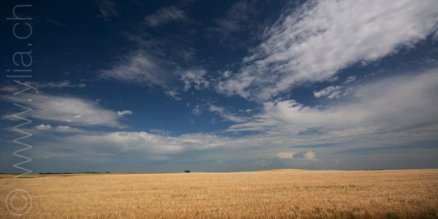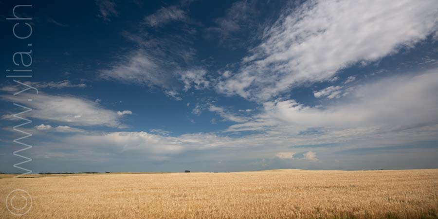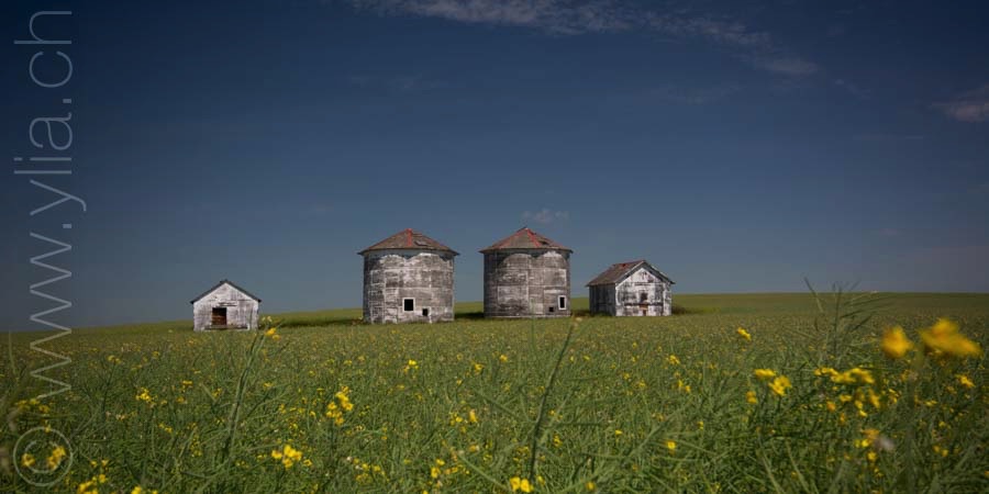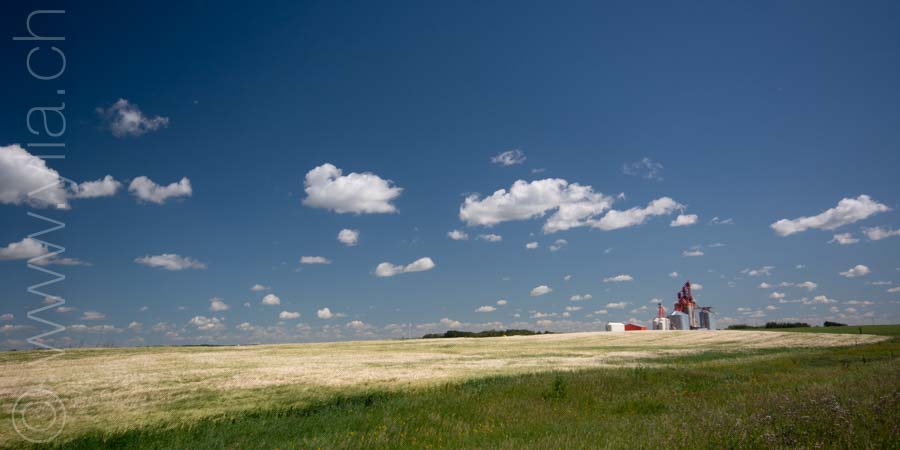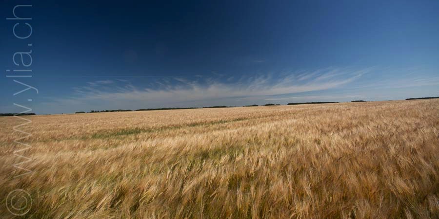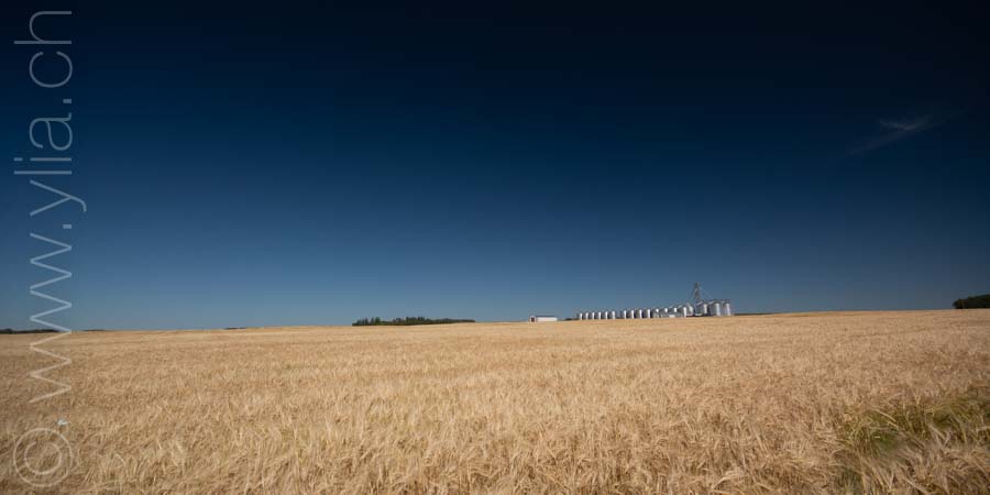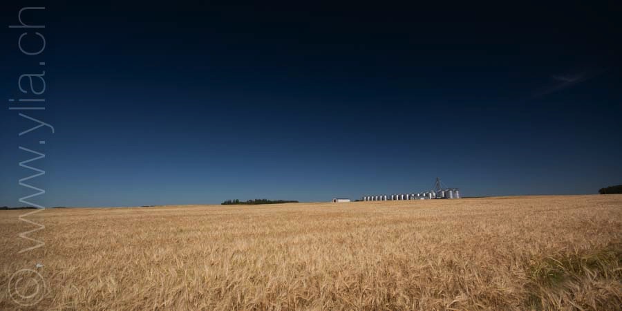 In Saskatchewan, we find in every village the grain towers that rise into the sky, like a leitmotif of the prairies. The ears of wheat are now golden yellow. They dance in the breeze or compose moving scenes in the breath of a rushing wind. We then have the sensation of looking at the sea, like waves dancing in the field.