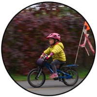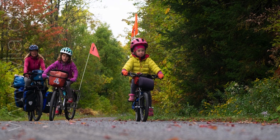 We take "les routes vertes" of Quebec, where Fibie can cycle. She is so excited that she rides 15 kilometers, and she is just three years old. She is so proud to be on her bike and excited to be able to ride for such a long time. The climbs are tiring, so we enjoy lots of small breaks. At just three years old, she is riding her bike and now she is swimming too!