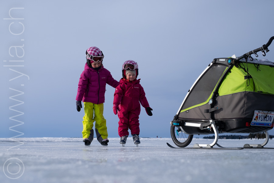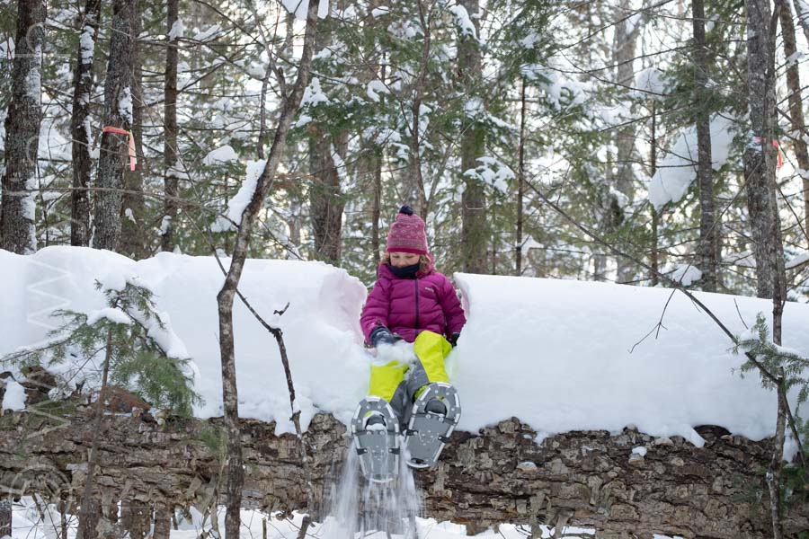 Now, the lake is covered with snow. We take our snowshoes or cross-country skis to explore this white desert. Fibie is pulled by a rope attached to the Thule chariot that Xavier moves. We transformed it for the winter by replacing the wheels with skis. We set off facing the gigantic white expanse of Lac Saint-Jean. Snow lines caused by the wind form sastrugi.