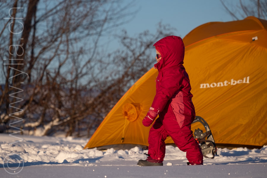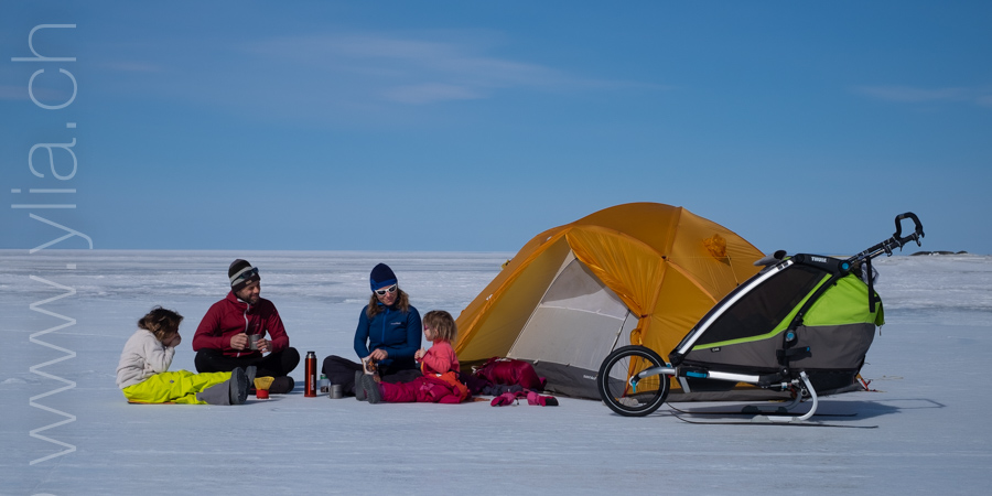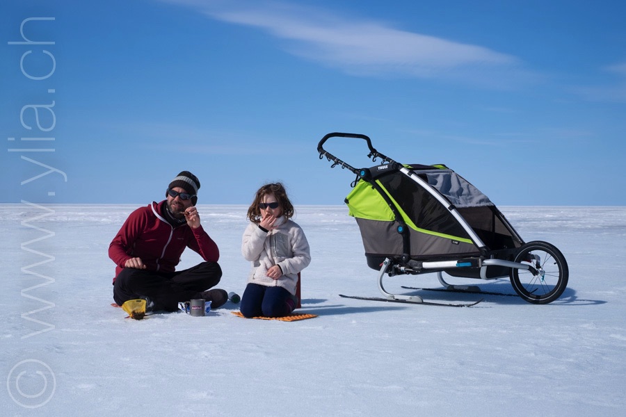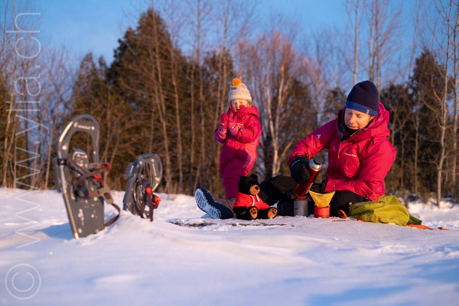 Today the sun is shining, with a light breeze. We head north, listening to the rustling of the snow and the cracking of the ice. In front of us, there are no visual landmarks, only this white expanse that reaches the horizon. This infinite attracts us and makes us feel free. We decide to stop for a picnic. It is -20°C. The sun shines brightly on the pristine snow. We enjoy the joys of the winter in Quebec.