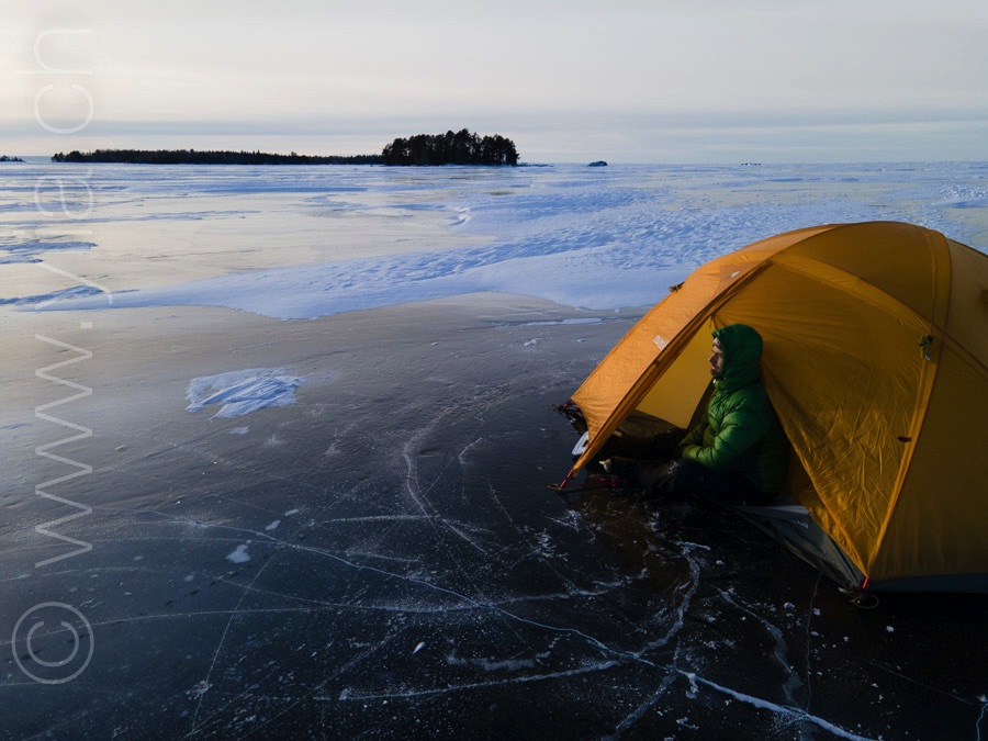 Lake Saint-Jean is entirely frozen, an ice desert of more than 1,000 km2. It is our playground. At the beginning of the winter, strong winds created a large, tangled ice barrier. Rain and cold temperatures then smoothed this frozen expanse. We take our skates and set up the tent on this clear, sometimes black ice. We feel as if we are walking on the abyss. We look down to see how thick the ice is, but we have the feeling that we are facing the infinite, at times to the point of vertigo.