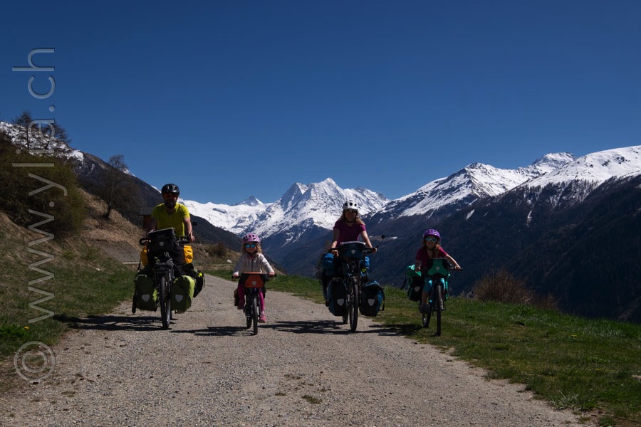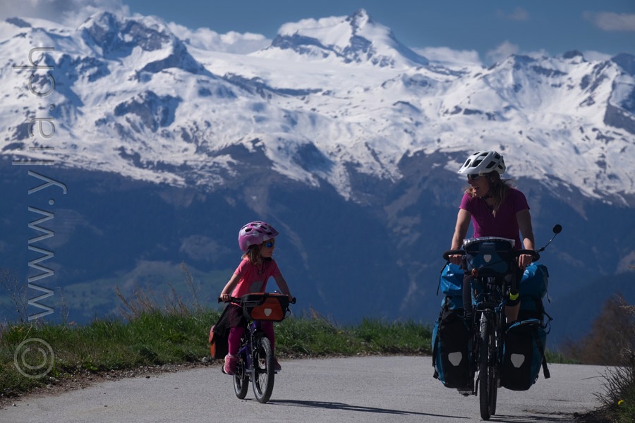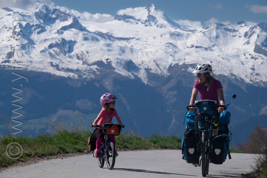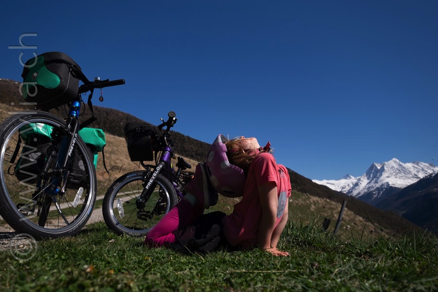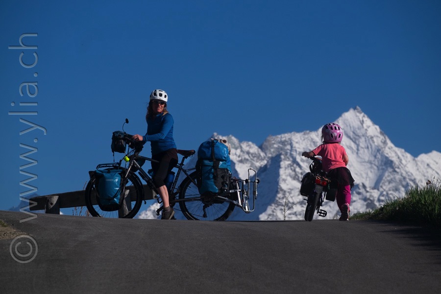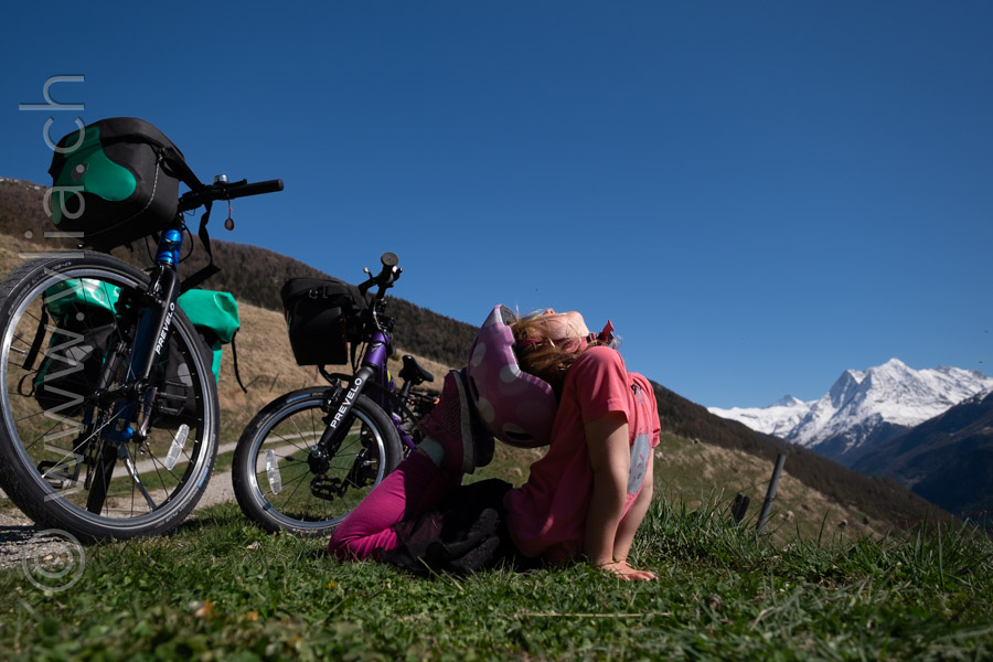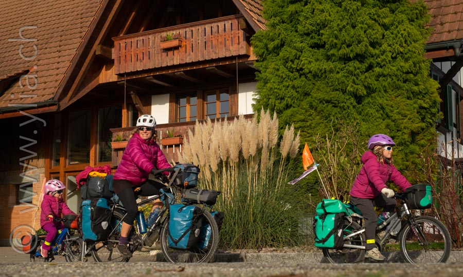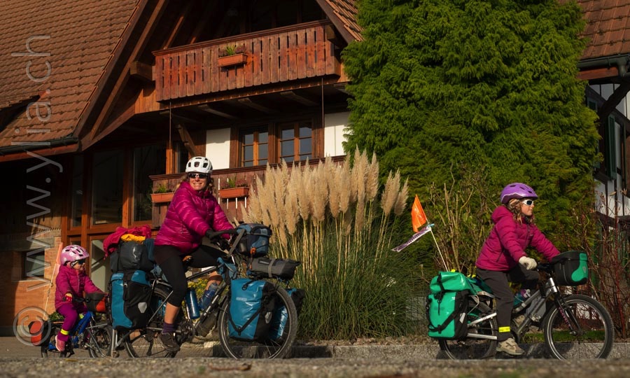 Arriving at the gates of Switzerland, we are enthusiastically welcomed by Thomas Weiss, who created FollowMe, the system that has allowed us to take Nayla and Fibie on the roads of the world for more than 32'000 km. We are at the border with Switzerland. Fibie has never been there before, and Nayla was just 2 years old the last time we went there. It's the first time in more than 11 years that we're back with our bikes. It's a feeling of coming full circle. We came back to the starting point, as if to give even more dimension to this life we have created and the vast wild spaces we have explored. We cross the Basel bridge. The Aare and then the Broye guided us to Ropraz, where we dared to take that first step, that first pedal stroke and that gigantic plunge into the unknown. Claire-Lise, Xavier's mother, was not aware of our arrival in Switzerland. What an excitement for the girls to organize this surprise! A frantic joy agitates them, and yet Fibie is slightly worried. What kind of welcome will she receive in Switzerland, she who knows nothing about this country and who has only met her grandparents? We walk in the door and it's an explosion of emotions!